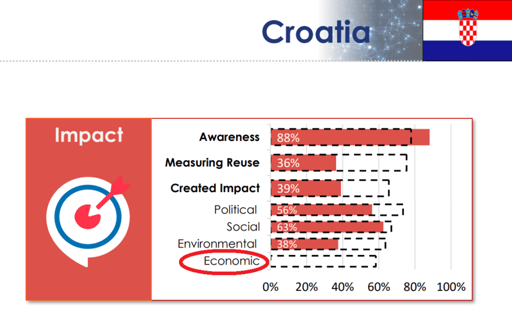 Prema izvještaju Europske komisije za 2022. godinu Hrvatska je po koristi od otvorenih podataka bila druga najgora članica EU-a. Ekonomsku korist analitičari su joj tada ocijenili s nula (0) bodova, što znači da Republika Hrvatska ne uspijeva ostvariti baš nikakvu ekonomsku korist unatoč ogromnim količinama svojih podataka i potencijalu kojim raspolaže.