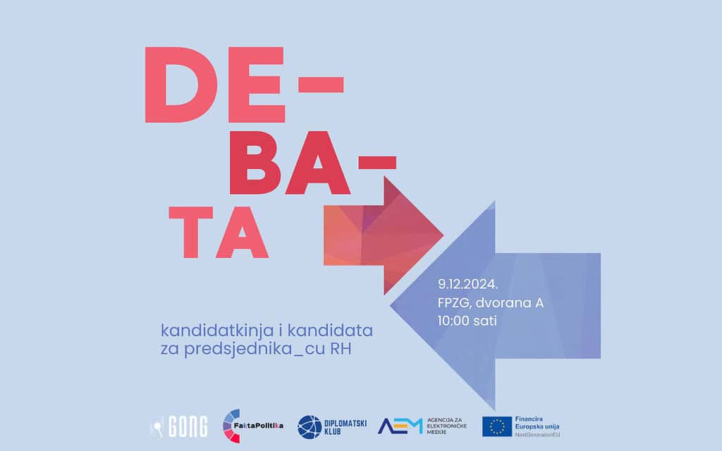 Gong, Fakultet političkih znanosti i Diplomatski klub FPZG-a organiziraju debatu kandidatkinja za predsjednika_cu Republike Hrvatske u ponedjeljak, 9. prosinca, u 10 sati, na Fakultetu političkih znanosti u Zagrebu (Trg Drage Iblera 10), u dvorani A.