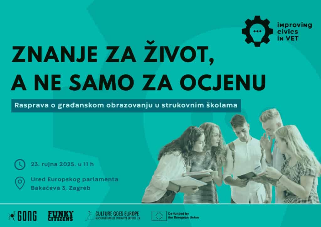 Gong organizira javnu raspravu o građanskom obrazovanju u strukovnim školama “Znanje za život, a ne samo za ocjenu”, koja će se održati u Zagrebu (prostorije Ureda Europskog parlamenta u Hrvatskoj, Bakačeva 3), u utorak, 23. rujna, od 11 sati.