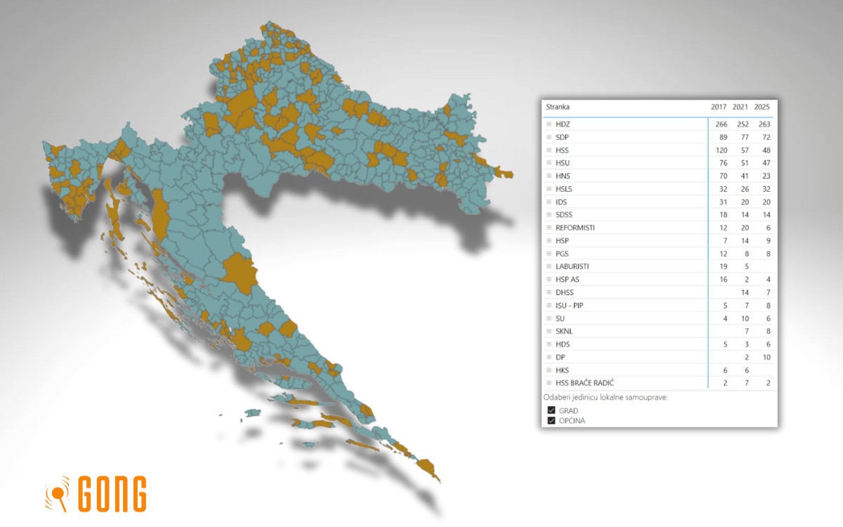 Gongova baza podataka: Pretražite tko je 2025. ostvario bolje, a tko lošije rezultate nego 2021. – po županijama, gradovima i općinama